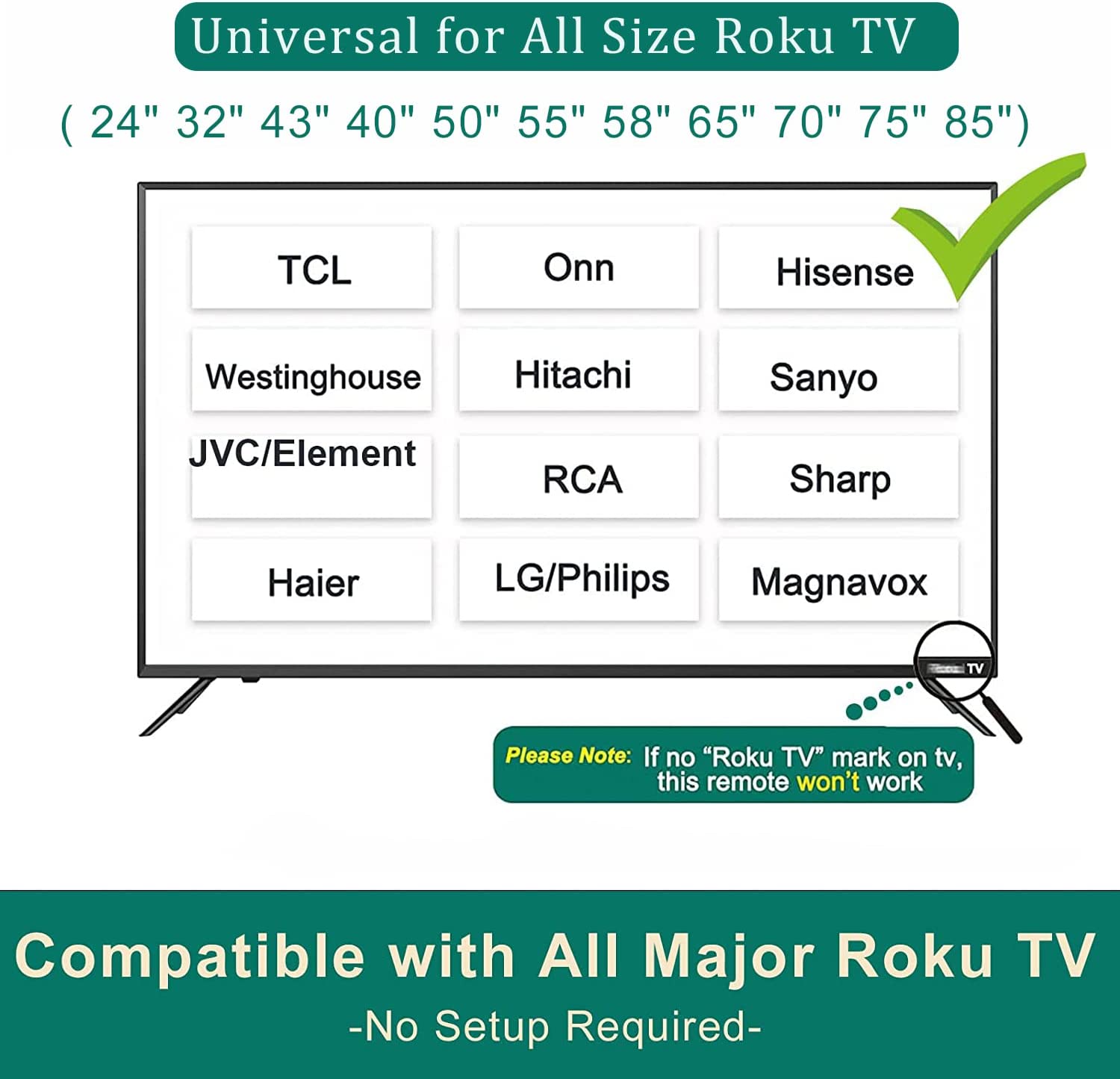 - ▶▶ Compatibility ▶ This replacement for roku tv remote, compatible with almost Roku TV, such as: for TCL Roku TV, for Onn Roku TV, for Hisense Roku TV, for Element Roku TV,for Hitachi Roku TV, for LG Roku TV, for Westinghouse Roku TV, for Haier Roku TV, for LG Roku TV, for Sanyo Roku TV, for Sharp Roku TV, for RCA Roku TV, for JVC Roku TV, for Philips Roku TV, for Magnavox Roku TV, etc ( Note: Only not compatible with Insignia Roku TV and other roku players or roku stick, but for brand of roku built-in tv listed here.)